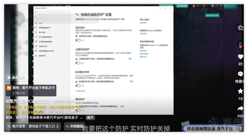 其中的教程视频中还会建议用户关闭Windows Defender(Windows 自带安全软件),称其会使电脑运行和下载速度变慢,然而这将会导致用户使用该盒子下载游戏或工具时感染DDos病毒,被用于攻击其他网站。
