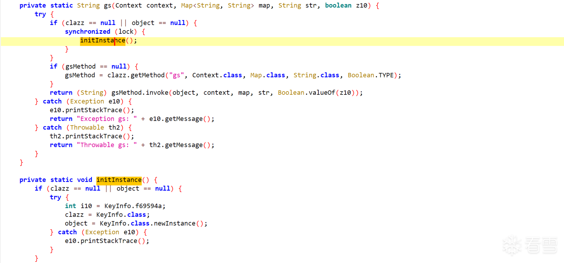哇塞,这里居然是反射调用!initInstance()里把clazz赋值为KeyInfo.class,然后通过反射调用gs()。难怪前面一直找不到具体实现,原来是藏在这里了。