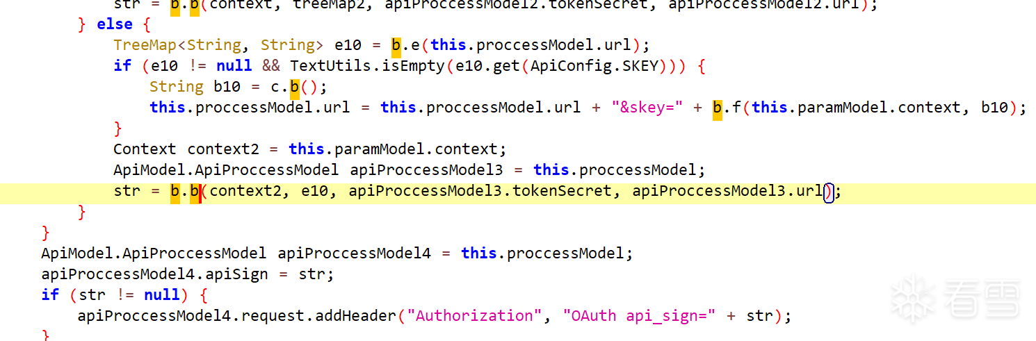 往上翻了一下,前面一堆初始化代码,但真正的赋值在这里:str是从一个b.b()方法来的。传了context、参数、tokenSecret和url进去。