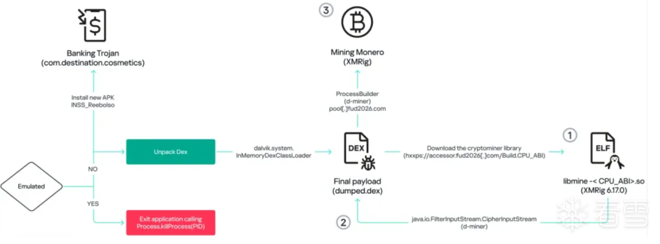 根据卡巴斯基(Kaspersky)研究人员的分析,BeatBanker是一种复合型威胁,它不仅具备银行木马的功能,能窃取用户的账户凭证、篡改加密货币交易,还集成了门罗币(Monero)挖矿模块,会在用户不知情的情况下耗尽手机性能。