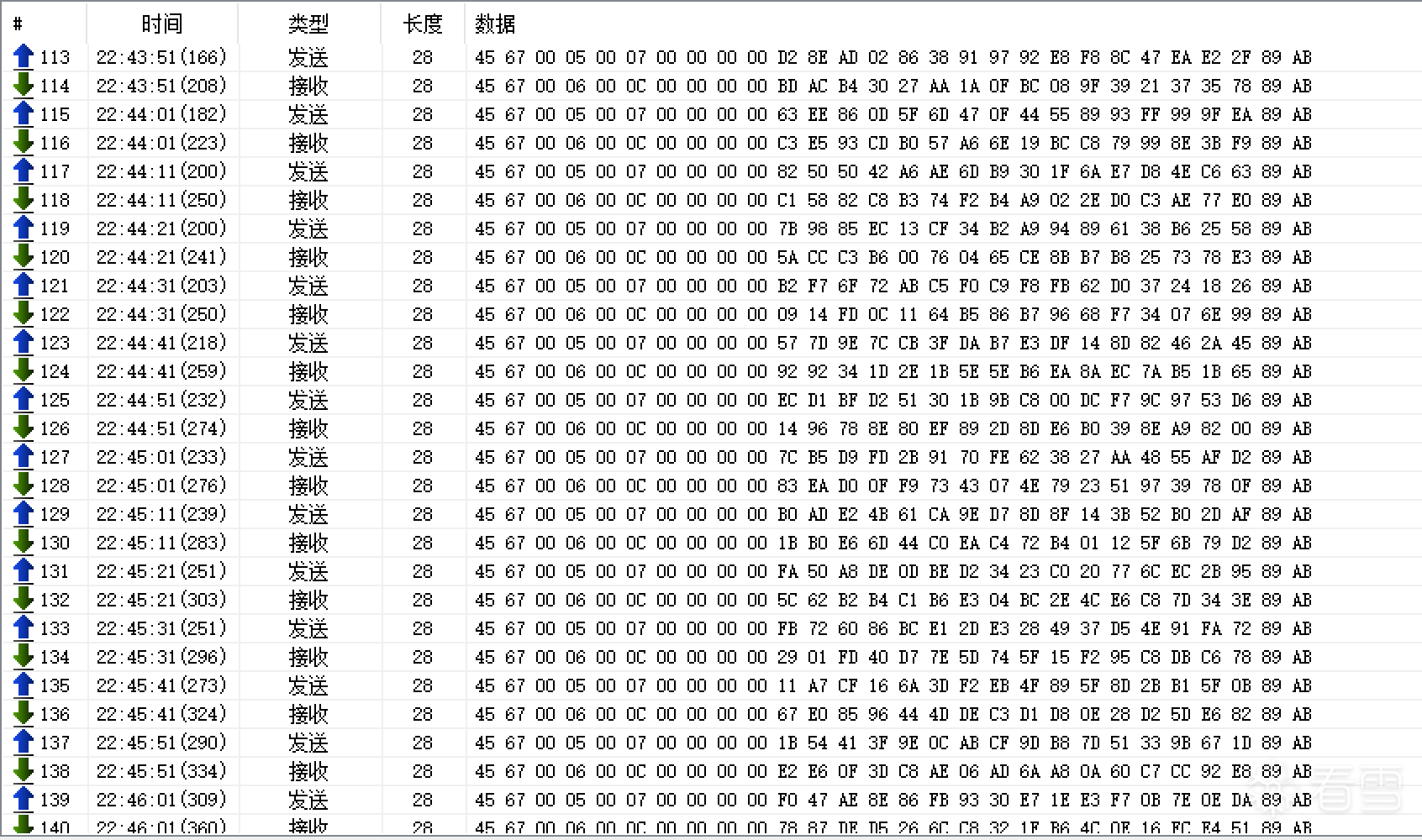 看原始字节流,能很快发现一个规律:每个数据包前固定以 45 67 开头,结尾固定是 89 AB,中间内容随操作变化且不可读。Magic 头尾明确,说明是自定义二进制协议,中间部分大概率经过加密或压缩处理。把这两个特征记下来,后续在代码里定位包结构时会直接用到。