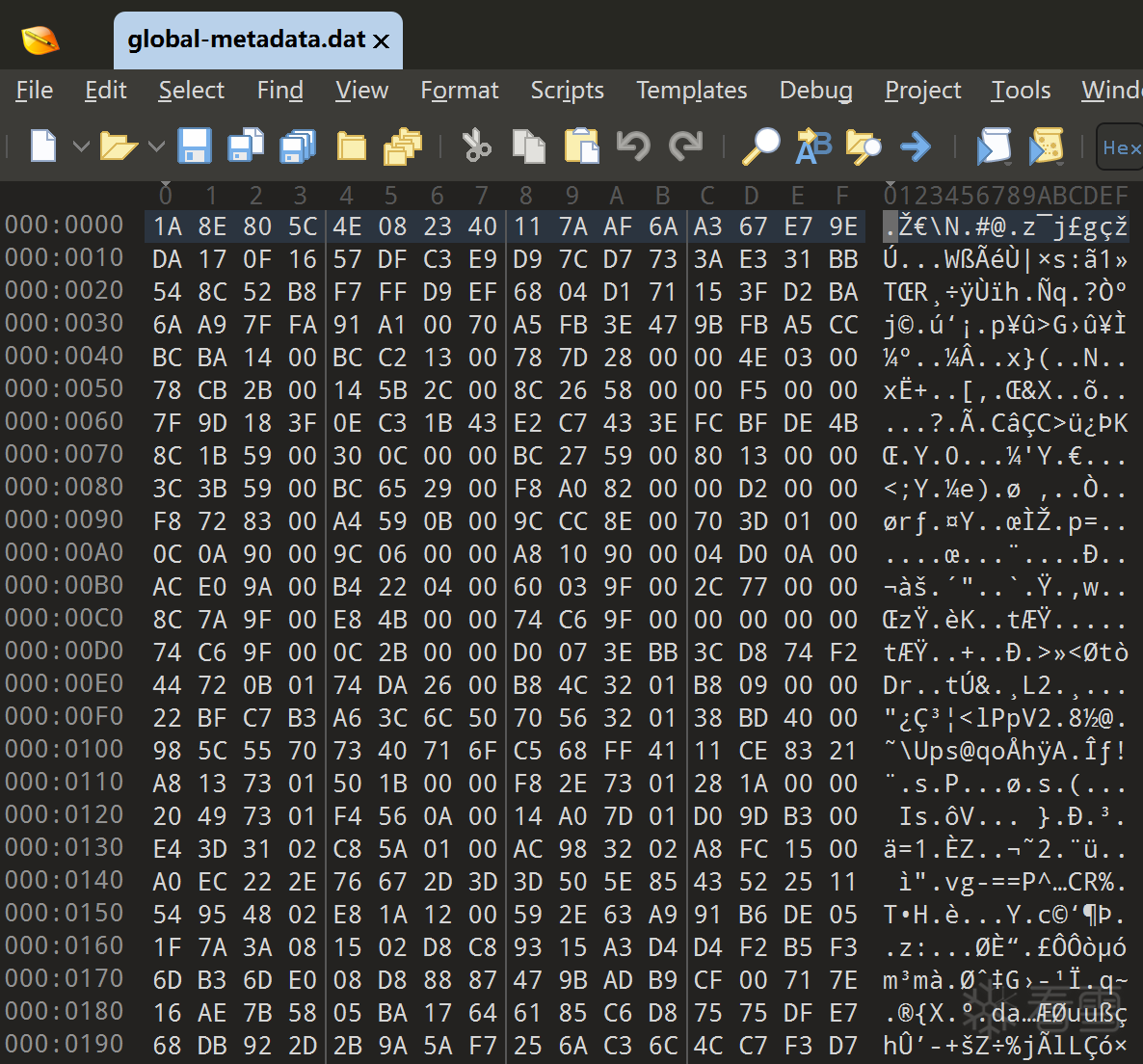 把 APK 解包后,第一步检查 global-metadata.dat 的文件头。标准未加固的 IL2CPP metadata 文件头是固定的 magic(AF 1B B1 FA),但这里头部字节不符,判断 metadata 要么被加密,要么做了自定义结构处理。走常规 Il2CppDumper 静态分析这条路行不通。