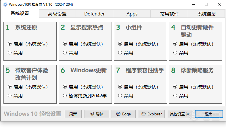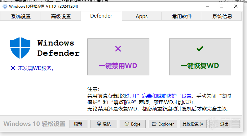 支持一键删除/禁用 Windows Defender,包括 Windows 安全应用程序、Windows 基于虚拟化的安全性 (VBS)、Windows SmartScreen、Windows 安全服务、Windows Web 威胁服务、Windows 文件虚拟化 (UAC)、Microsoft Defender App Guard、Microsoft 驱动程序 Windows 10 /11版本上“设置”应用程序中的阻止列表、系统缓解措施和 Windows Defender 页面