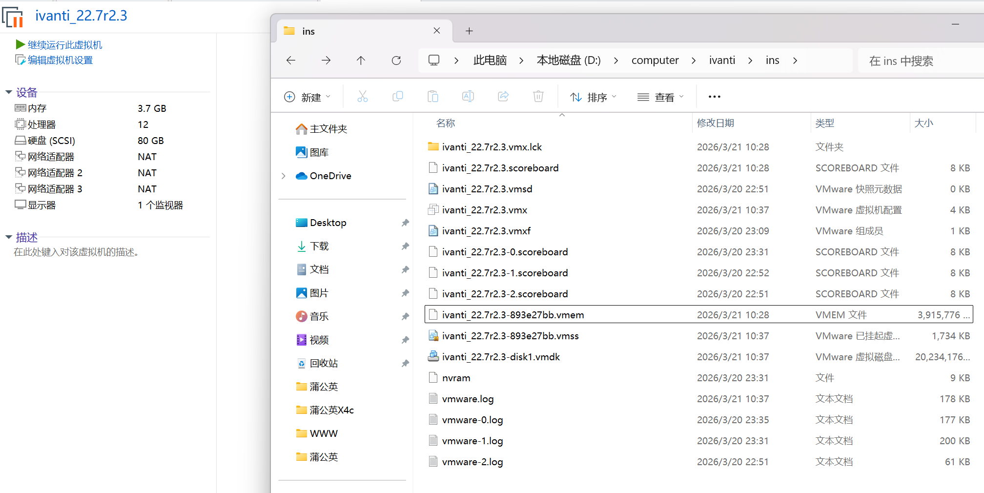 将虚拟机暂停后,会在虚拟机的目录下看到一个vmem的文件,这是该虚拟机的内存,如下: