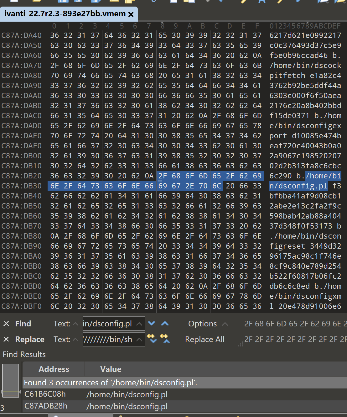 我们将虚拟机挂起后,把该vmem文件拖到010 editor中对其进行修改,将所有内存文件中的/home/bin/dsconfig.pl字符串为///////////////bin/sh。(为什么是///////////////bin/sh,因为/home/bin/dsconfig.pl是21个字符,要保证/bin/sh也是21个字符所以前面添加 / 保证和/home/bin/dsconfig.pl一样长,这样才不会导致内存偏移发生改变。)