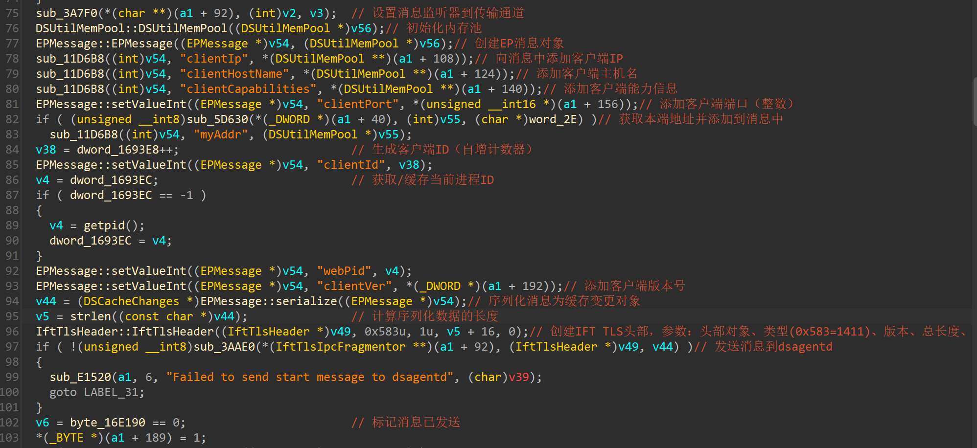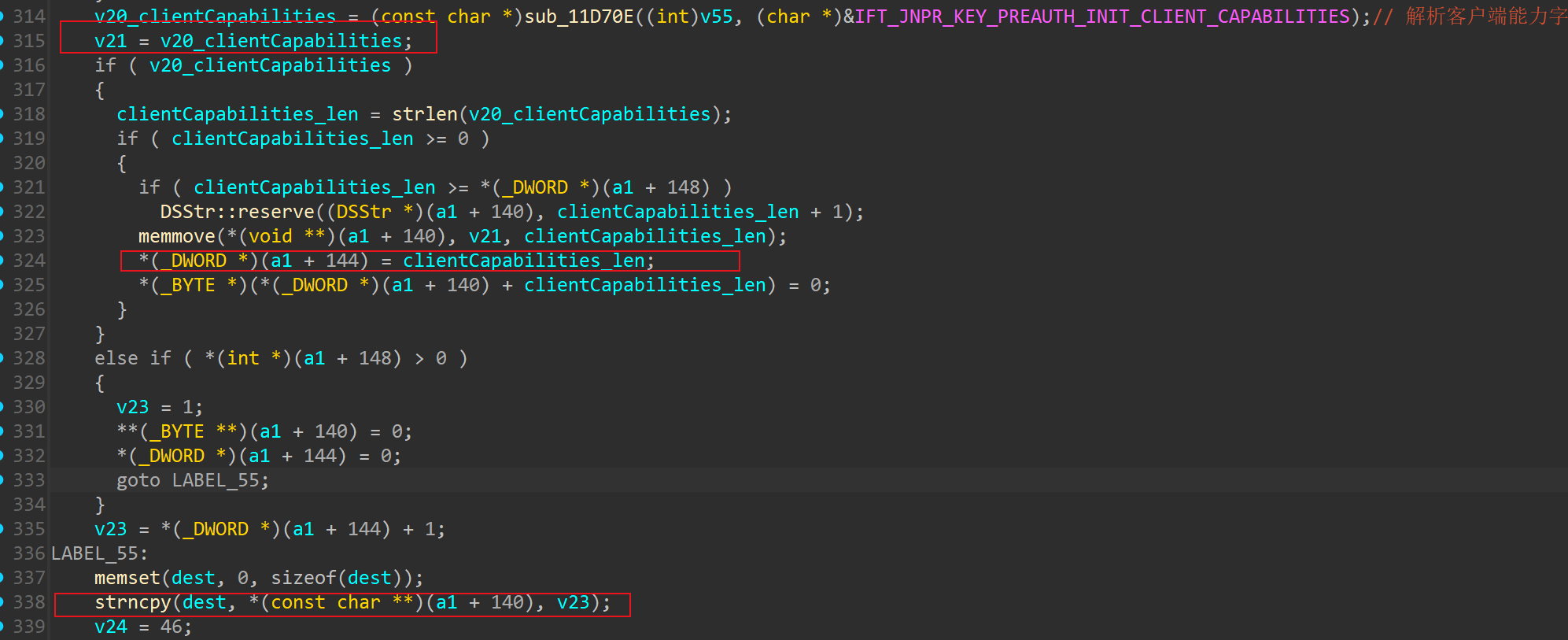 *(_DWORD *)(a1 + 148): 获取 clientCapabilities 字符串缓冲区当前的 容量。DSStr::reserve(...): 如果当前容量不足以容纳 clientCapabilities_len + 1 个字节,则调用 reserve 函数重新分配更大的内存空间给 a1 + 140 指向的字符串缓冲区。