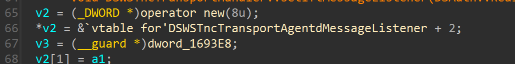 DSWSTncTransportAgentdMessageListener 类有一个虚函数表,其中应该包含消息处理函数。