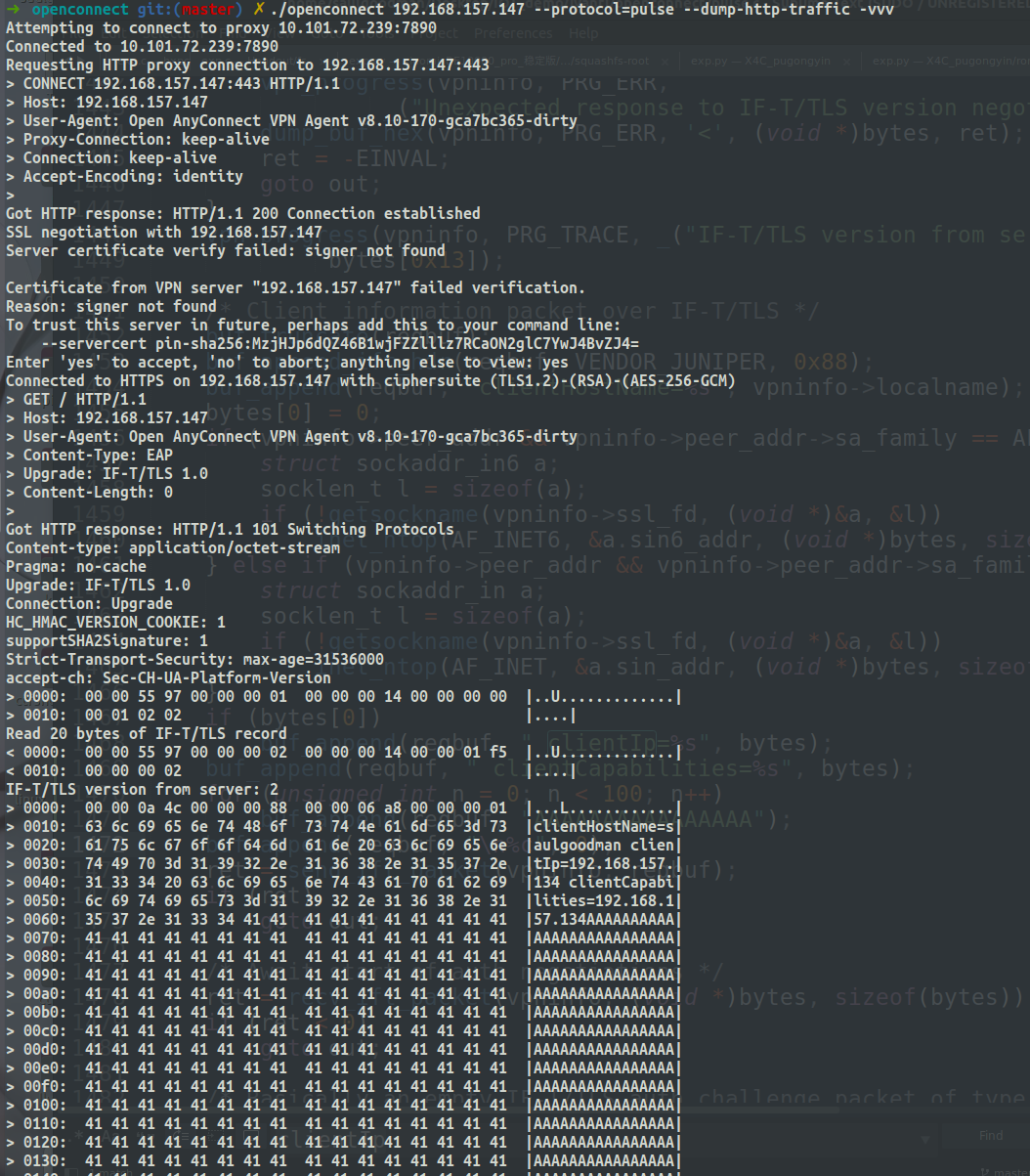 使用当前文件夹下也就是我们改版过的openconnect对目标站点(target_ip/需要根据自己IP进行修改)进行测试。--protocol=pulse指定使用Pulse Connect Secure协议,--dump-http-traffic显示所有HTTP请求和响应的原始数据。-vvv最高级别的调试。