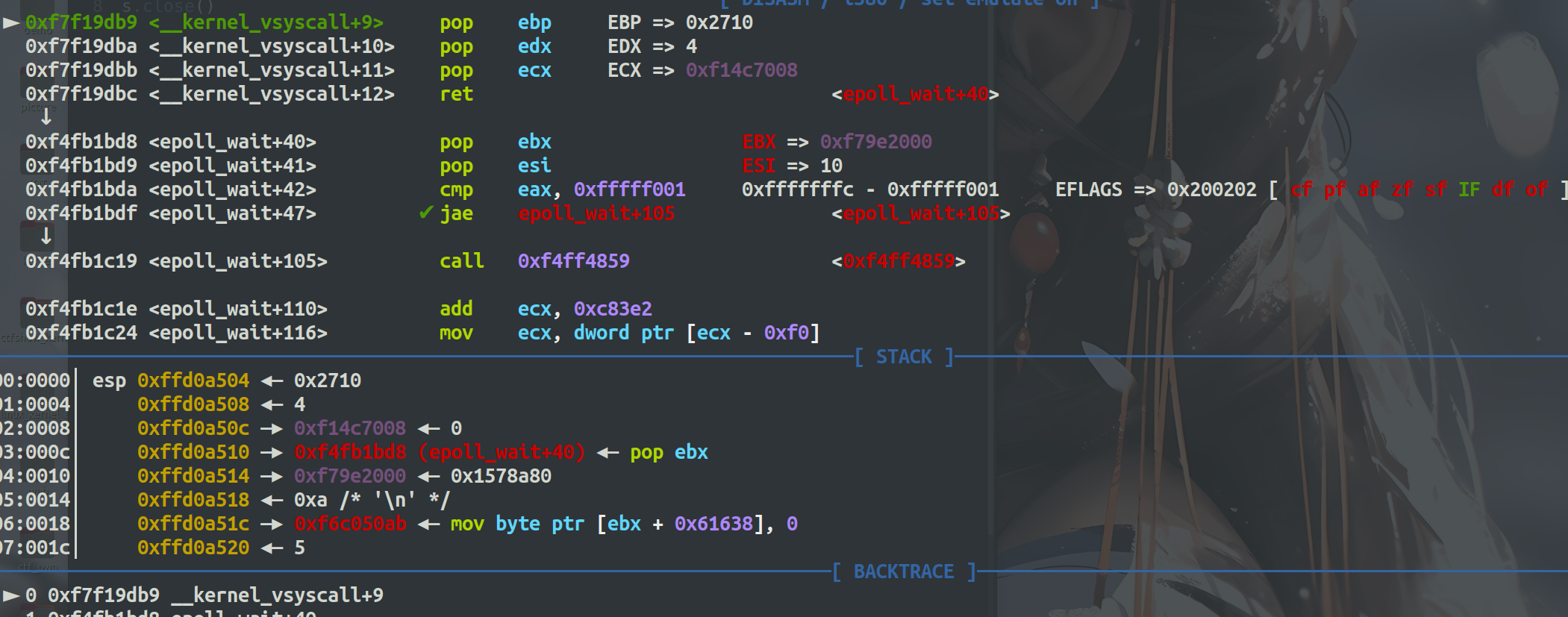 echo 0 > /proc/sys/kernel/randomize_va_space #验证是否为0 cat /proc/sys/kernel/randomize_va_space # 重启web服务 killall web #再从gdb中观察内存地址是否固定 target remote IP:1234 #查看内存布局 info proc mappings