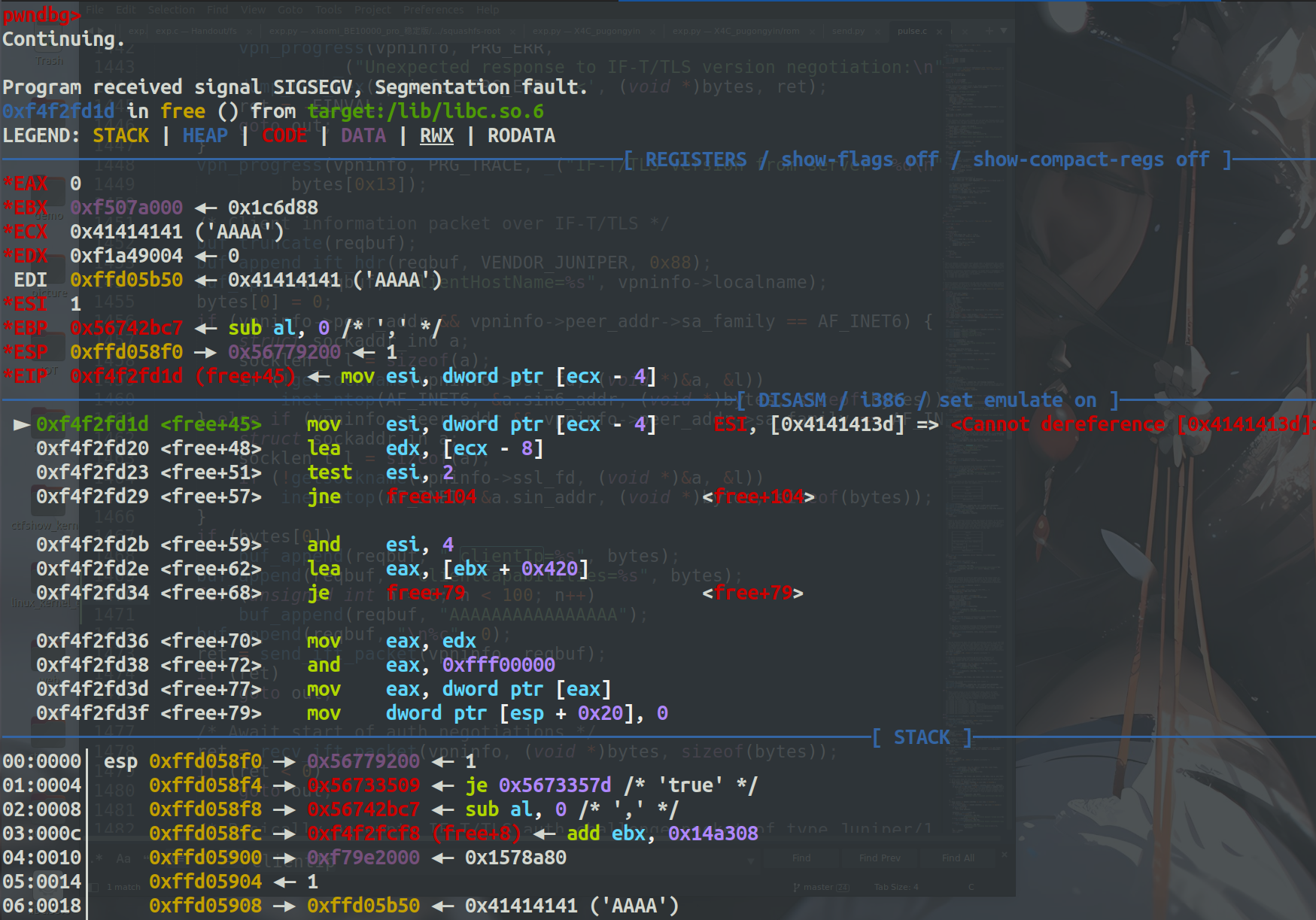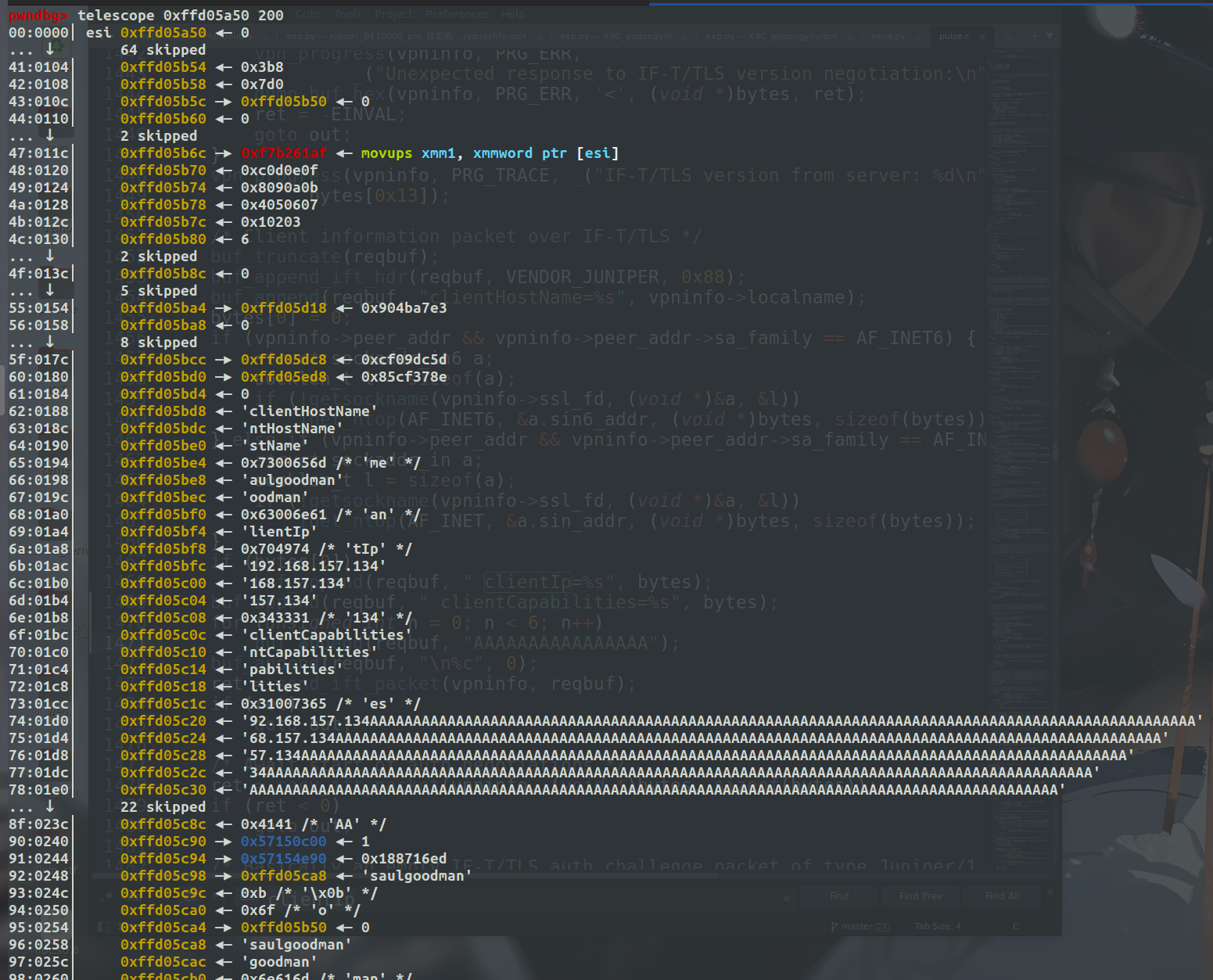 有了这个地址就方便多了,然后还有个问题就是openconnect并不能很好的发送ROP数据,因此我们还得用python来写,然后gadget都是来自于libdsplibs.so