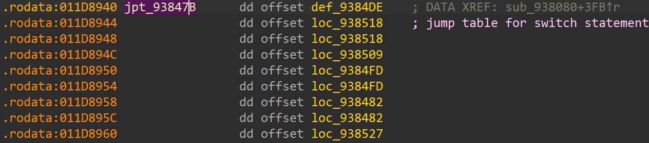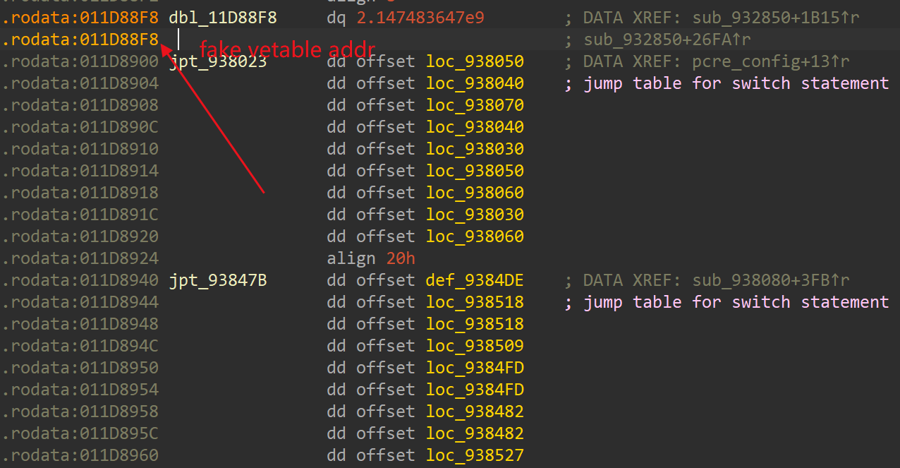 然后按照代码逻辑,我们只要反着算就行, 例如我们这里最后vtable 的地址是 0x11D88F8, 那么就需要有一个地址存储这个指针, 直接在 ida 的binary search里搜索