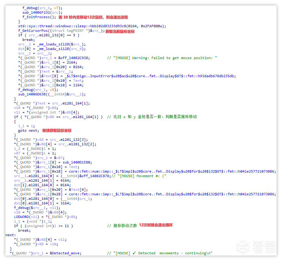 通过循环调用GetCursorPos API获取当前鼠标坐标,其中检测到前后两次鼠标坐标发生变化时,即认为发生一次鼠标移动。如果在30秒内检测到的鼠标移动次数不足12次,则程序判定当前环境可能为自动化或沙箱环境,并主动退出进程。