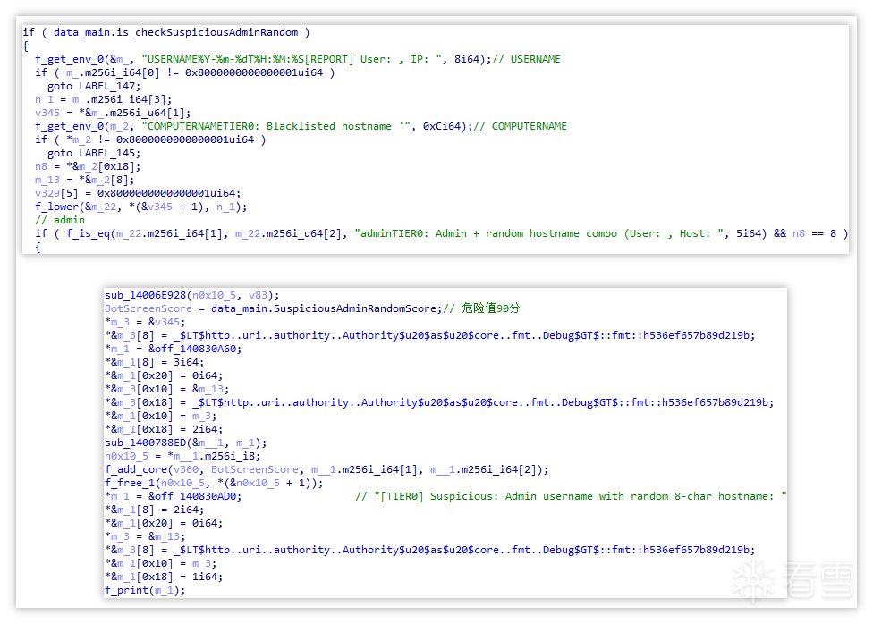 还会检查USERNAME(用户名)为admin且COMPUTERNAME(主机名)为`[A-Z][a-z]{7}`形式时会将危险值增加90分。