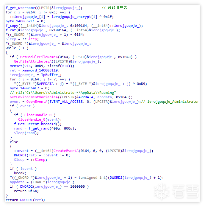 随后会检查是否有ierojgoqwje_{username}事件是否存在,若不存在则会创建并返回1并继续执行,若存在则会返回0并退出进程。
