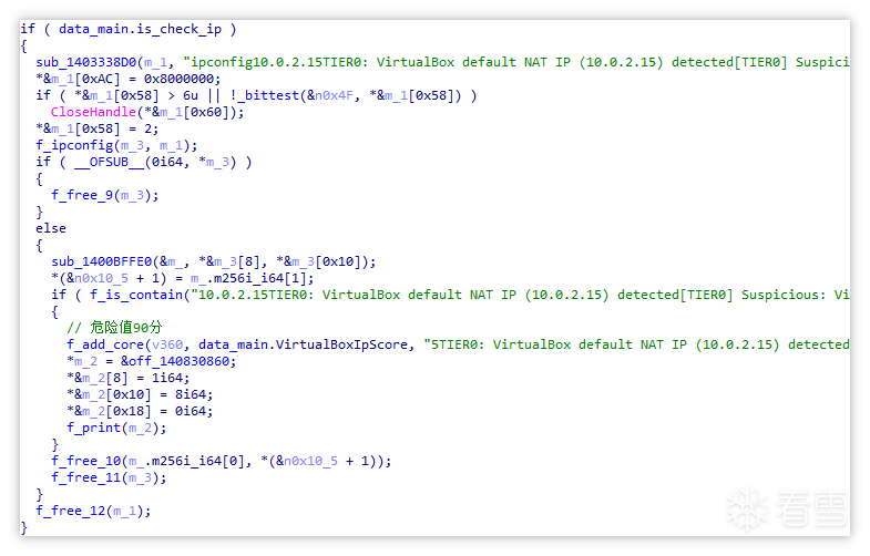 利用ipconfig程序获取IP信息,并检查是否包含10.0.2.15字符串,从而判断是否为VirtualBox虚拟机,危险值为90分。