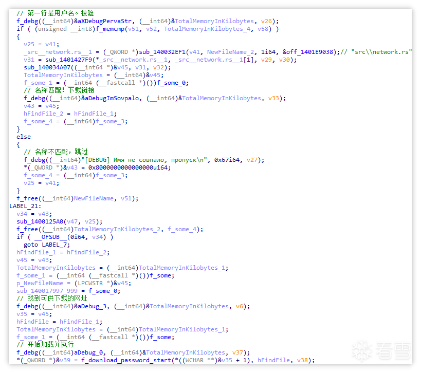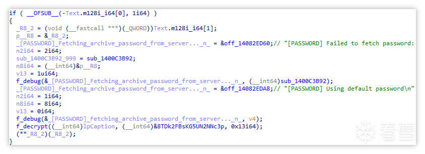 此时获取到0的时候会进行验证,若为0则不会继续往下执行,若不是0,则会将首行数据作为用户名进行校验,若与当前系统中的用户名相同则会下载文件并执行,其中的解压密码链接也是67dK9s2c8@1M7s2y4Q4x3@1q4Q4x3V1k6Q4x3V1k6H3j5i4y4@1k6h3u0A6L8W2)9J5k6h3y4G2L8g2)9J5c8Y4u0S2N6#2)9J5c8V1@1$3d9%4c8Z5b7e0g2K9i4@1f1@1i4@1t1^5i4K6S2q4K9s2c8@1M7s2y4Q4x3@1q4Q4x3V1k6Q4x3V1k6K6L8X3W2H3M7r3g2@1i4K6u0W2K9r3!0K6N6q4)9J5c8Y4g2A6K9$3!0K6P5q4)9J5c8Y4u0S2N6#2!0q4x3#2)9^5x3q4)9^5x3R3`.`.