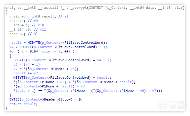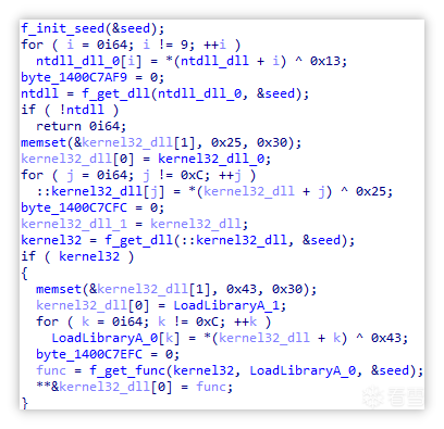 获取函数地址:下图为该恶意样本解析ntdll.dll、kernel32.dll基址并获取LoadLibraryA等API地址的相关代码。分析可见,样本内的DLL名称与函数名称字符串均经过异或加密存储,且不同目标字符串使用了不同的异或常量。