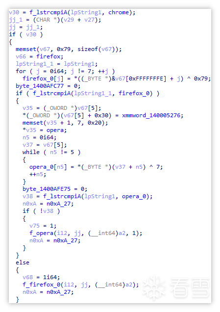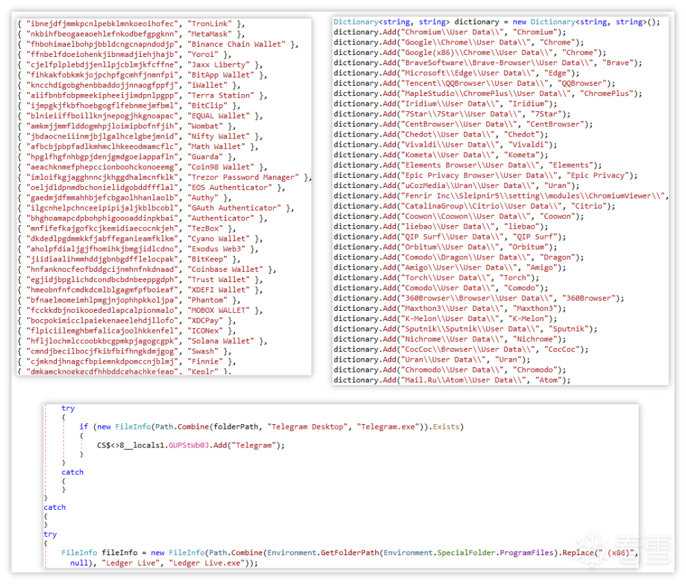 浏览器与钱包均借助服务器下发的配置实施窃取操作。其中,针对浏览器,服务器会下发需窃取的浏览器名称,诸如Chrome、Firefox、Opera等,这些名称将被传入相应函数;钱包是通过下发具体钱包路径进行窃取。然而,由于在分析过程中无法访问服务器,故而无法确定具体窃取了哪些加密货币钱包。