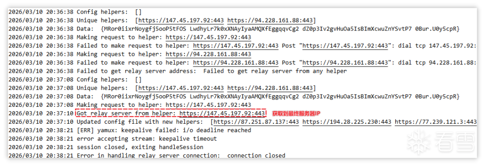 反向代理模块同样是通过读取自身文件中的资源进行手动加载,并执行,其中反向代理模块是通过Go语言而写,先会通过几个接入服务器(helpers)获取到中继服务器(relay server),并将主动连接中继服务器,从而形成持久连接。