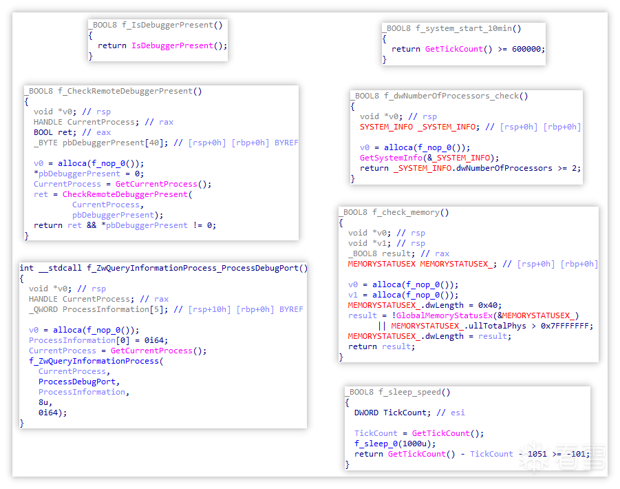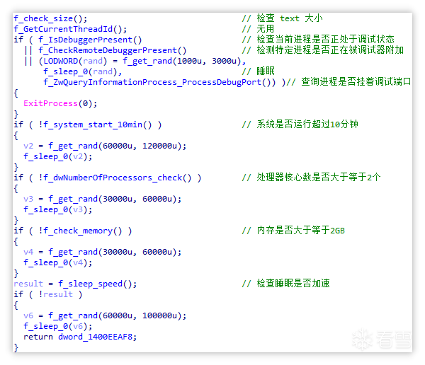 反调试与反沙箱:除上述大小自检之外,还将检查是否处于调试状态。若处于调试状态,将直接通过ExitProcess终止该进程。此外,还会检测系统运行时间是否超过10分钟、处理器核心数是否大于等于2个、内存大小是否超过2GB,以及检查睡眠是否加速等。若不符合要求,将等待3至12分钟不等的时长。