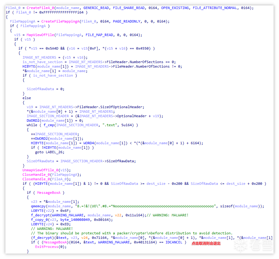 有意思的是该窃密病毒会检查自身大小是否符合预期,会通过检查.text节的SizeOfRawData 是否落在目标大小(0x98200)± 0x200的范围内。若不符合,则弹出“WARNING: MALWARE!”警告框,提示样本在分发前应经过packer/crypter保护;若用户点击取消,则进程直接退出,从而可以看出该窃密病毒是分发给其他人使用的产品。