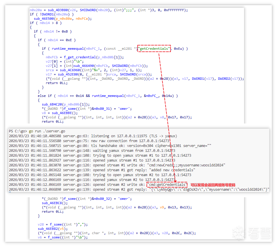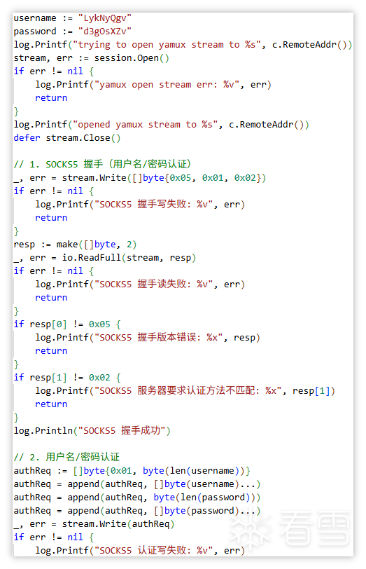 其中可以发现使用的用户名与密码为LykNyQgv和d3gOsXZv,这是通过发送 “cmd:getCredentials”指令获取到的代理服务用户名与密码,也可通过 “cmd:newCreds;;;username:password”的方式创建新的用户名与密码,此外还有kill和 restart等指令,其中kill会直接终止当然进程。