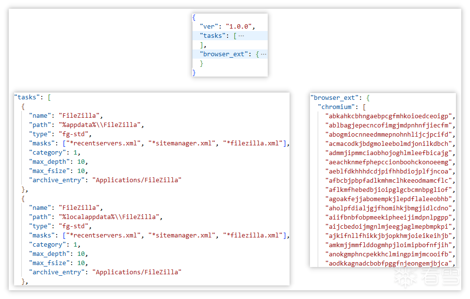 配置经过JSON格式化后有两千多行,通过AI进行总结后可得出窃取的信息分为五大类别:应用配置与通信工具:
