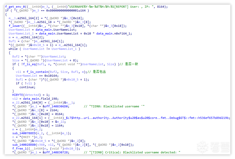 通过GetEnvironmentVariableW API获取USERNAME的值,并与上述黑名单用户名列表进行比对,只要包含则会直接退出进程。