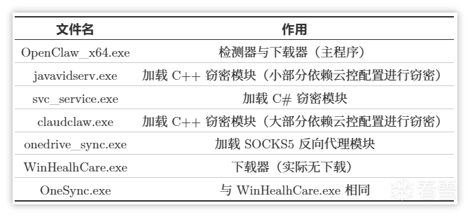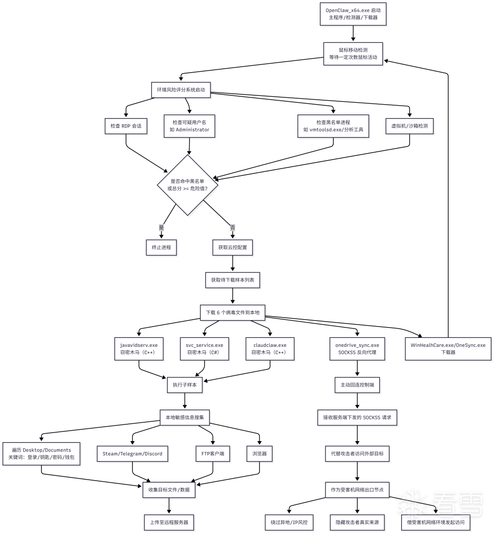 文件构成如下:其中OpenClaw_x64.exe是主程序,同时也是检测器和下载器,会继续下载另外6个病毒文件。其中javavidserv.exe、svc_service.exe、claudclaw.exe都属于窃密木马,只是实现方式和具体窃密逻辑略有不同。WinHealhCare.exe与OneSync.exe的行为和 OpenClaw_x64.exe较接近,也会主动获取云控配置,并从中取出下载链接继续下载其他载荷,本质上也是下载器。onedrive_sync.exe是SOCKS5反向代理,一般用于隐藏攻击者IP。