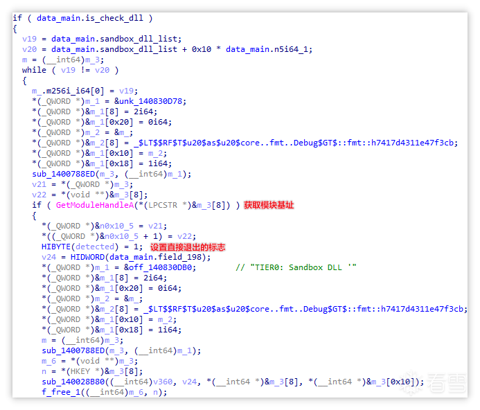 利用GetModuleHandleA API获取上述沙箱相关模块名的基址,若存在则会直接退出进程。