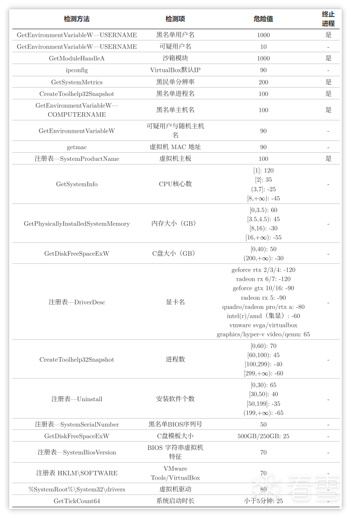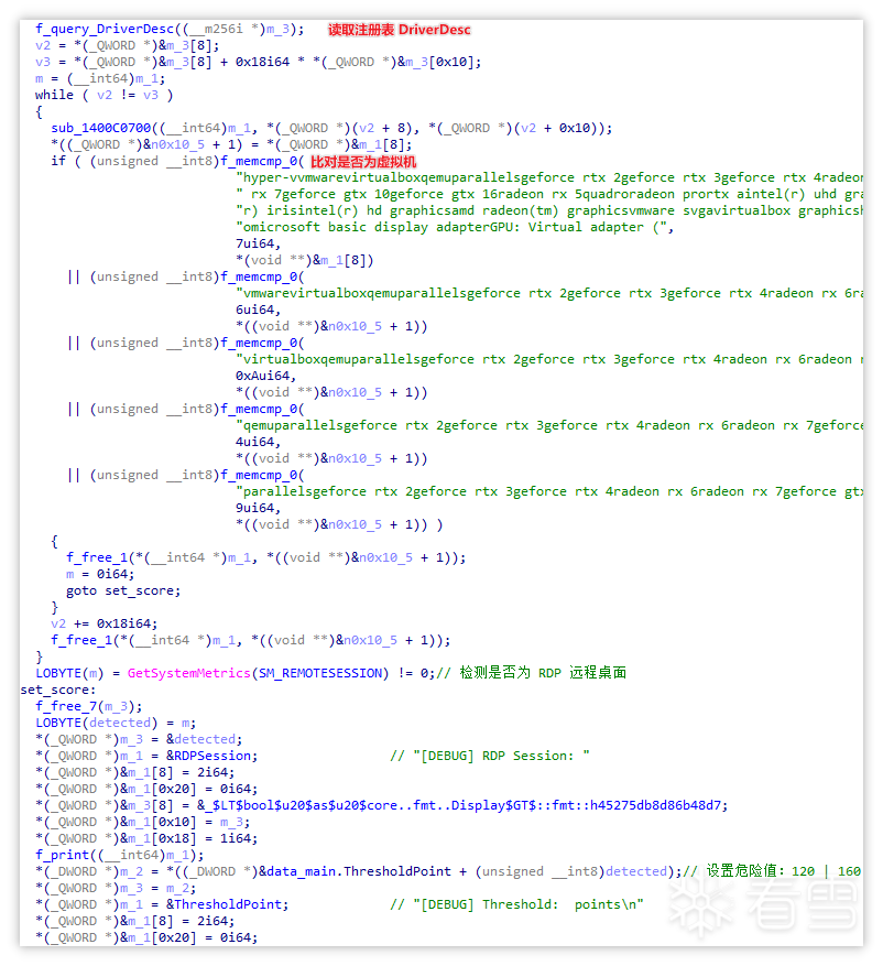 样本读取注册表 HKEY_LOCAL_MACHINE\SYSTEM\CurrentControlSet\Control\Class\{4d36e968-e325-11ce-bfc1-08002be10318}\0000 项中的 DriverDesc值,并通过与hyper-v、vmware、virtualbox、qemu、parallels进行对比,若存在则会直接设置危险值为120,若不存在则会检查是否为RDP远程桌面,若是RDP远程桌面则给予160,若不是则给予120,其中危险值为最大容忍值,后续会利用检测系统信息时出现敏感信息则会进行加分,一旦加分超过至危险值则会退出进程。
