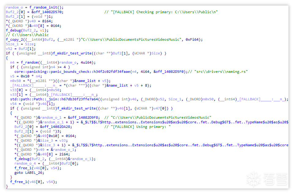 首先,样本优先选择C:\Users\Public作为下载根目录。在该路径下,还会额外获取随机数,从Documents、Pictures、Videos、Music四个目录名中随机选择一个进行拼接,从而形成诸如C:\Users\Public\Documents、C:\Users\Public\Pictures之类的目标下载路径。