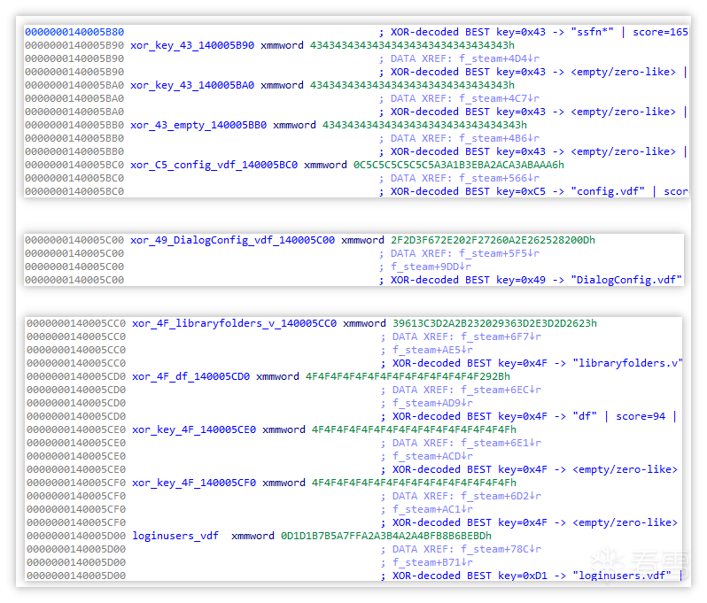 窃取 Steam 关键文件:根据Software\Valve\Steam注册表获取SteamPath值,从而在 Steam文件夹中获取ssfn*、config.vdf、libraryfolders.vdf、DialogConfig.vdf、loginusers.vdf之类的Steam关键文件。