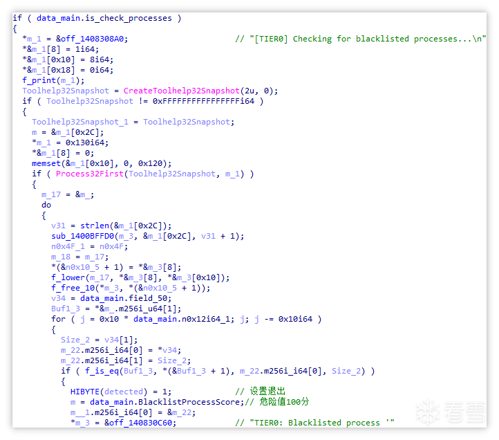 通过CreateToolhelp32Snapshot与Process32First遍历进程并与上述进程名(调试器、虚拟机工具、沙箱、系统工具)进行对比,若一致则会设置退出进程。