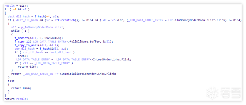 获取指定DLL基址:通过PEB中Ldr模块链表遍历已加载模块,并对模块名进行哈希匹配,从而获取DLL基址。