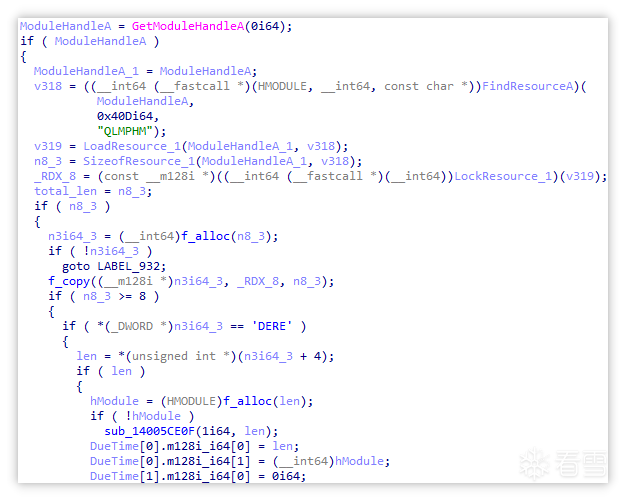 从当前文件中获取资源QLMPHM,并利用ERED进行验证并分段获取被异或加密的窃密木马本体,最终手动加载。