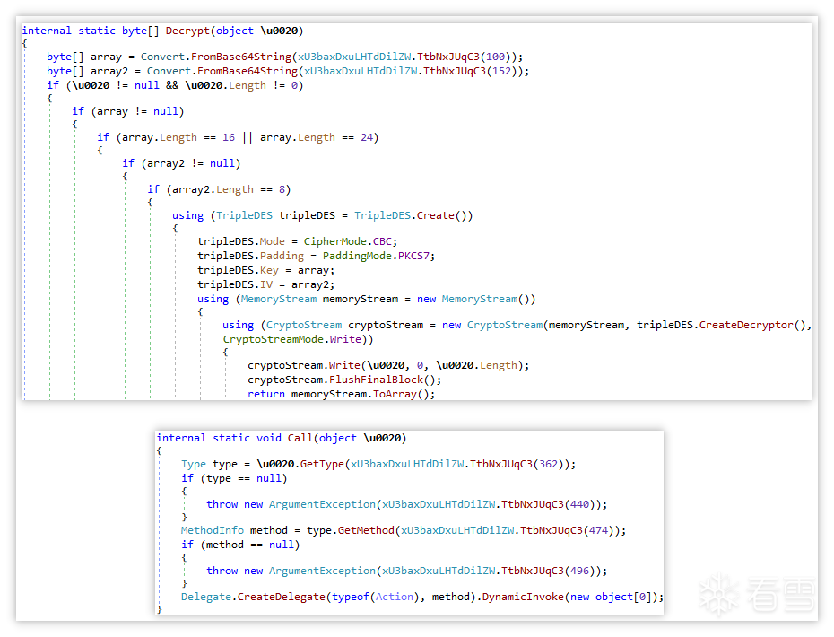 该程序会先利用DES算法解密出窃密模块,随后加载并调用 Ct8B5RBrTjnQxcaEhe.QgYcUwqGbJd0ciKbtd类中CejW9Rtrp方法。