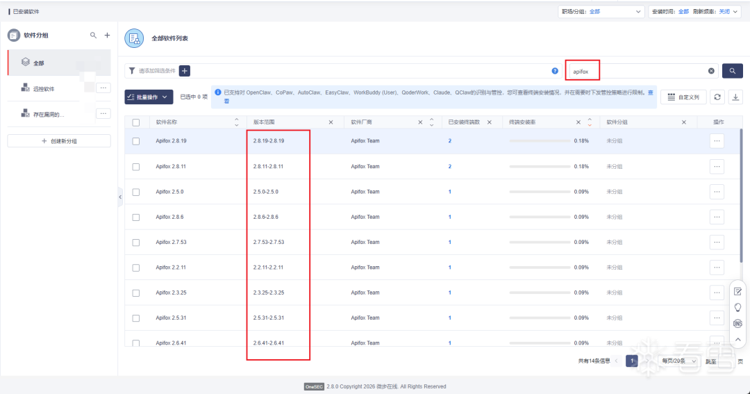 建议同时根据安装Apifox的版本来确定要升级范围,对于低于2.8.19版本的机器进行及时升级。这些低版本机器未出现ioc反连,也建议做各类密码、token和key的轮换或者重置: