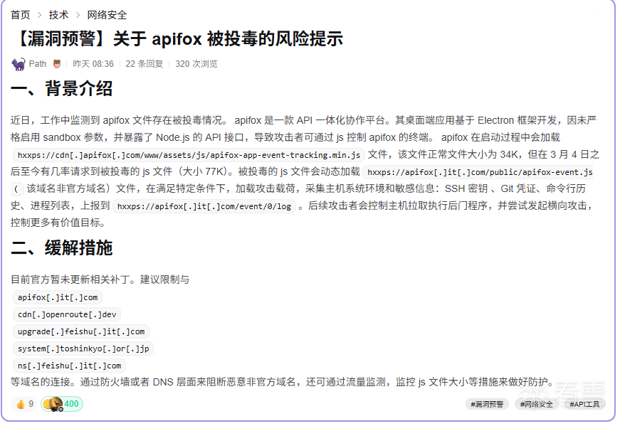 2026年3月25日8点36分,在2libra论坛上有用户爆出知名API协作研发平台Apifox存在投毒攻击: