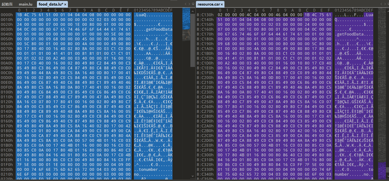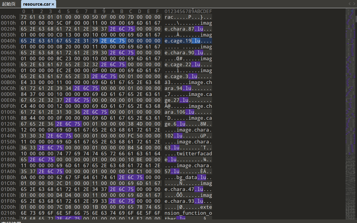 liblua.so作为引擎库,需要载入.lua的脚本文件,在assets/resource.car中找到了相关的结构: