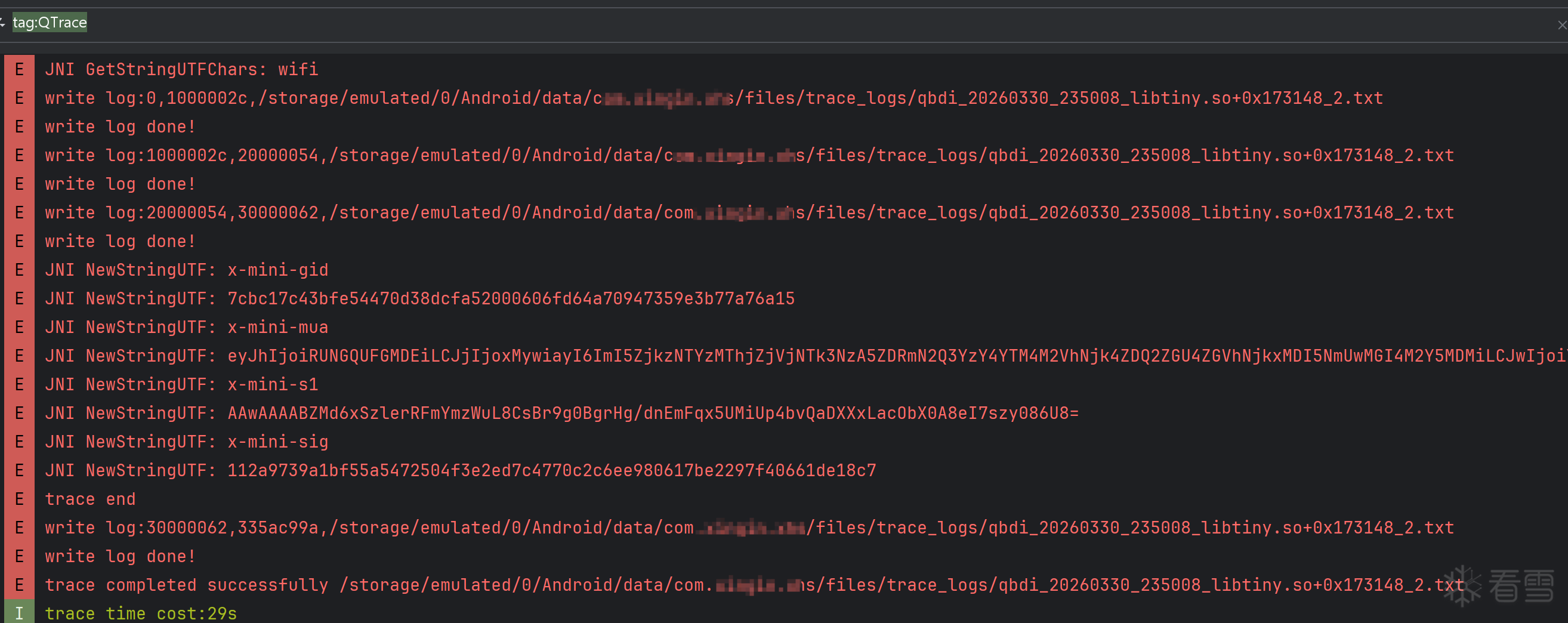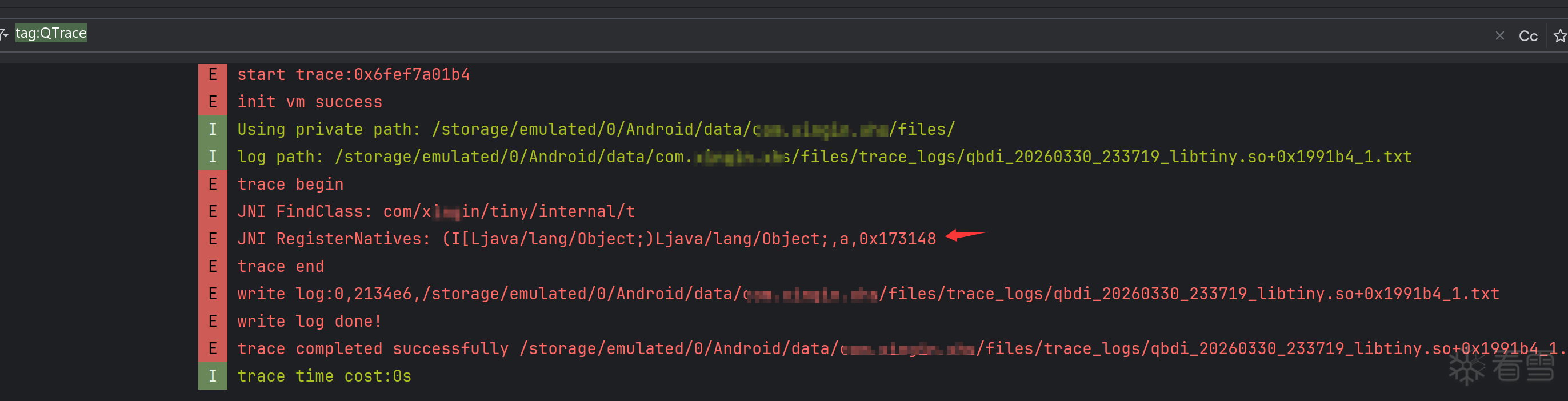 使用项目自带的inject.js注入so,在logcat中过滤QTrace,可以看到实时的trace日志: