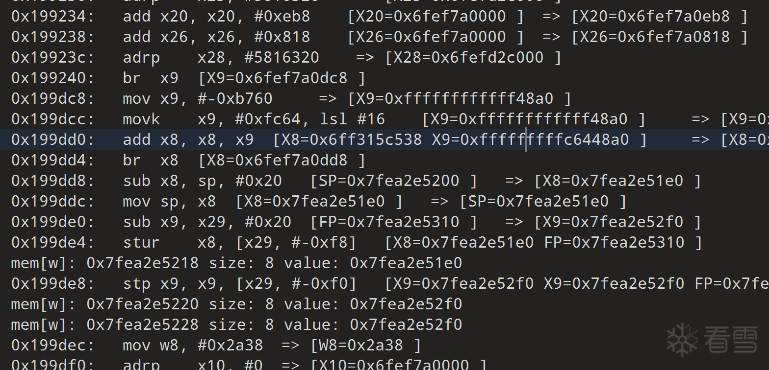 trace的过程中,会自动解析br,blr指令。如果目标地址命中自定义的libc函数,jni函数,或so本身的其他函数,则会根据你的定制规则进行解析。‘