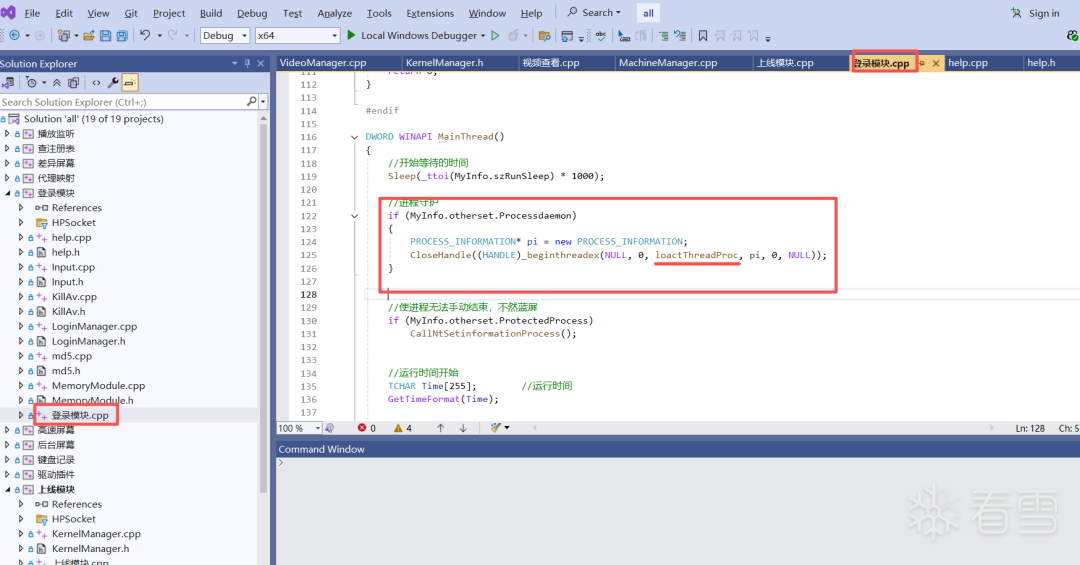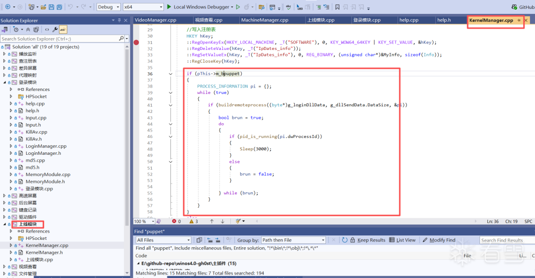 这个选项名起的有点让人费解,其本意是说如果被控被手动结束了,例如在任务管理中结束,会让被控所在的机器出现蓝屏。这是被控自我保护的措施。好在,这个功能在现在大多数电脑上已经失效。其实现逻辑在被控上线模块中,实现位置如下图,也是位于登录模块中。