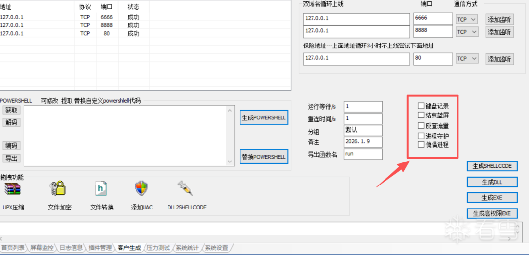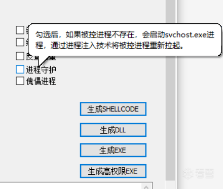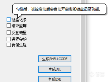在银狐生成被控端的界面,有5个可选项,分别是: