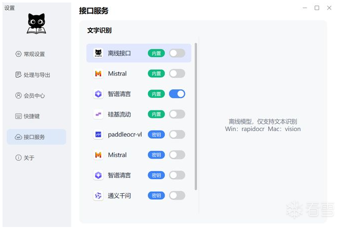 SpCat是一款强大且好用的OCR识别工具,通过它可以精准识别图片中的文字、数字以及表格,即便是复杂的数学公式,也可以轻松识别,然后将其转换成可编辑的word文档或者是excel表格,工具内置了四款AI大模型,并且可以离线使用,它界面纯净,使用简单,即便你是电脑小白也能轻松上手,是一款不可多得的图片识别神器。