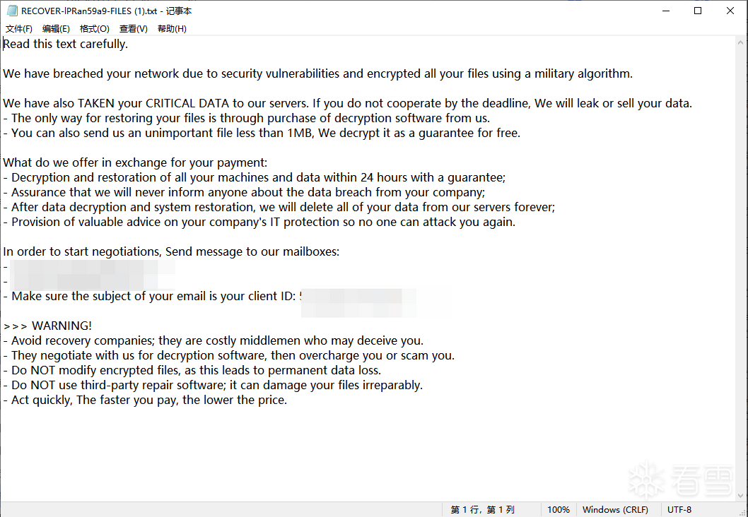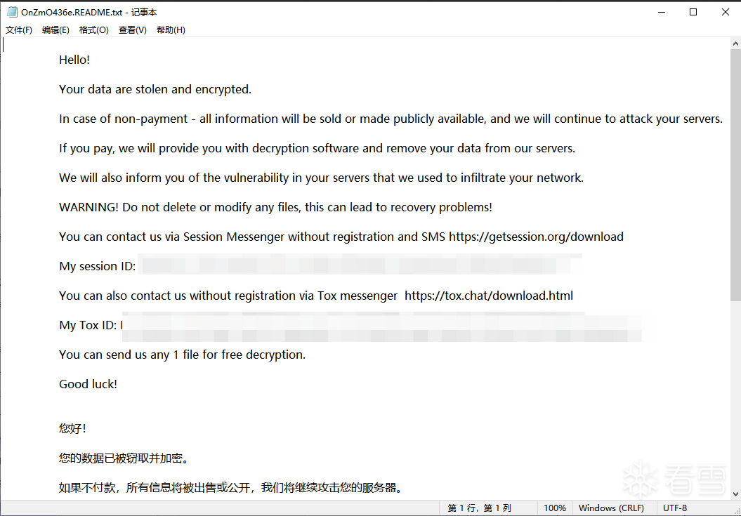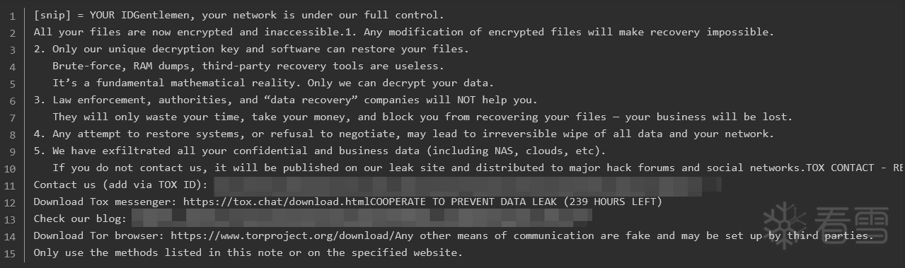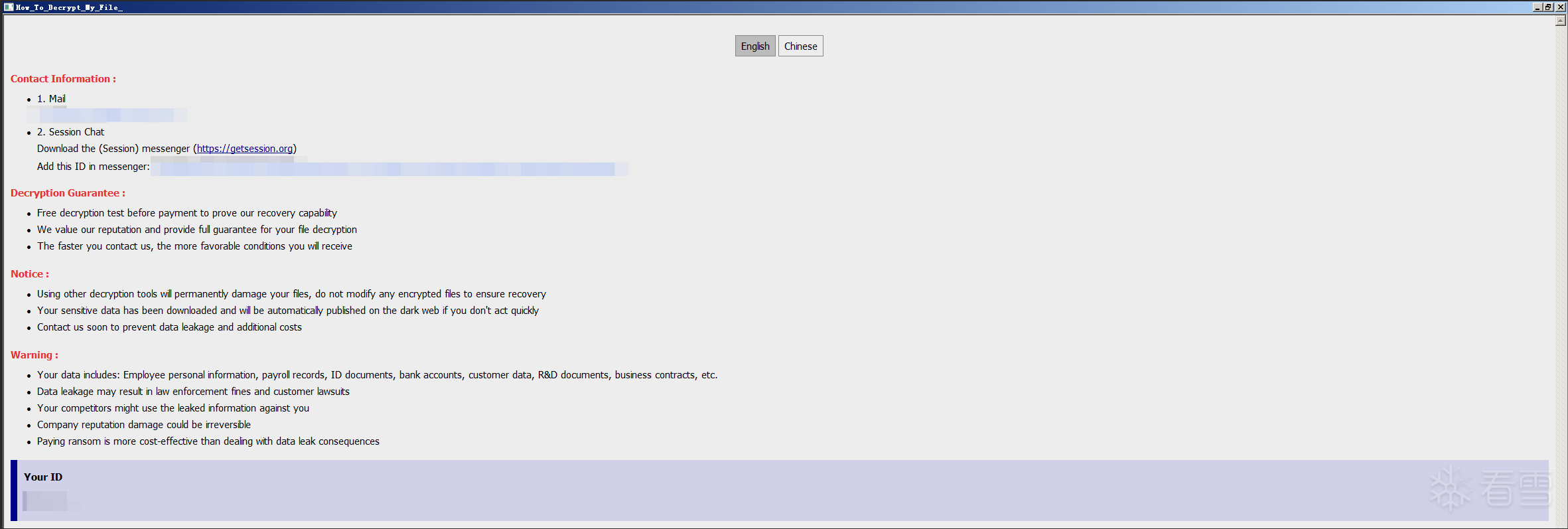 - 组织特征:表现出极强的本地化属性,其勒索信原生支持标准中文与英文双语切换,这在国际勒索家族中较为罕见 。
