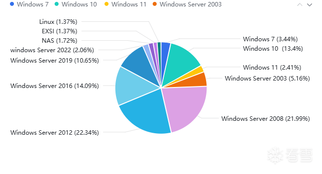 2025年受灾资产操作系统分布研判 数据显示,老旧服务器资产已成为勒索攻击的“重灾区”。其中,Windows Server 2008 (21.8%) 与 Windows Server 2012 (20.38%) 合计占据了超过 42% 的受害比例,这表明攻击者正集中利用 EOL(已停止维护)系统的未修补漏洞进行定向突防。虽然 Windows 10 (15.17%) 在终端侧仍面临较高风险,但值得警惕的是,ESXi、NAS 及 Linux 等关键基础设施也开始频繁出现在受害清单中(合计约 5.2%),预示着攻击面正从传统 Wintel 架构向虚拟化与存储层级深度扩展。